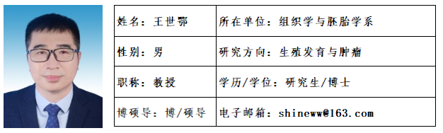 王世鄂,男,1969年12月26日,中共党员,医学博士。现任福建医科大学党委常委、副校长,兼干细胞工程与再生医学福建省高校重点实验室主任。学术兼职:中华医学细胞生物学分会委员、中国中西医结合学会生殖医学专业委员会委员、中国解剖学会医学发育生物学分会副主任委员、福建省解剖学会副理事长、福建省细胞生物学与转化医学学会副理事长、福建省高等教育学会理事会副会长;《中国细胞生物学学报》、《中国组织化学与细胞化学杂志》和《中国实验动物学报》等期刊杂志编委。