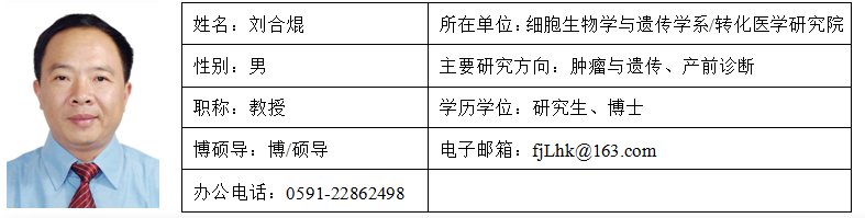 刘合焜,男,1963年10月生,理学博士,博士生导师。1984年南京大学生物系获理学学士学位,1991年南京大学生物系硕士研究生毕业获理学硕士学位,2005年四川大学医学遗传学专业博士研究生获理学博士学位,2010年福建医科大学临床医学博士后流动站出站。现任福建医科大学转化医学研究院副院长,细胞生物学与遗传学系教授,福建省干细胞转化医学协同创新中心副主任兼秘书长,福建省癌症和神经退行性疾病转化研究重点实验室副主任。从事细胞生物学、医学遗传学和肿瘤遗传学的教学和科研工作,尤其肿瘤遗传、遗传病、产前诊断等医学遗传学和分子遗传学研究。2002年9月至2006年2月先后在人类疾病生物治疗国家重点实验室疾病基因组研究室、国家人类基因组北方研究中心、农业生物技术国家重点实验室“畜禽基因组与分子数量遗传学创新研究群体”从事博士研究和国内访问学者。2010年和2016年两次在美国哈佛医学院卢坤平教授实验室访问学者。