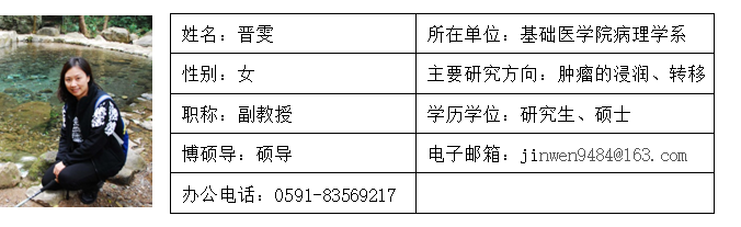 晋雯,1991年毕业于福建医科大学,2000年获医学硕士学位,现为福建医科大学副教授、硕士生导师,福建省抗癌协会病理分会委员,中华医学会病理学分会细胞病理学组委员。2007年作为校骨干教师公派前往美国宾州Geisinger 医学中心进修细针穿刺病理学诊断技术。
