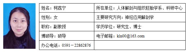柯荔宁,女,1977.7,中共党员,医学博士。2008年7月毕业于福建医科大学神经病学专业取得医学博士学位,2012-2014年于南方医科大学完成博士后研究。现任足球资讯-足球新闻最新 科研中心主任,人体解剖与组织胚胎学系副教授。