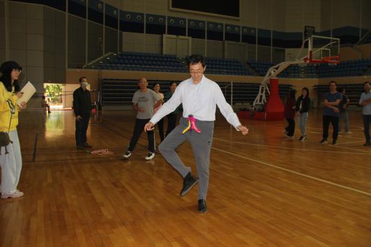 11月11日下午,足球资讯 工会在旗山校区综合体育馆举办2020年学院趣味运动会。副院长罗道枢主持活动,全院50位教职员工,分成五队参加了踢毽子、集体跳神、定点投篮三个项目。