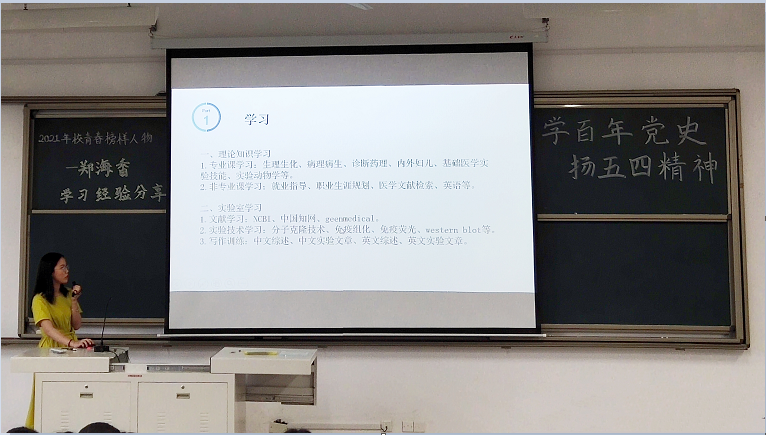 为深入贯彻落实习近平新时代中国特色社会主义思想和党的十九届五中全会精神,引导广大青年深入学习,推进青年学子向身边的“青春榜样”学习,2021年5月16日晚,足球资讯 “聆听榜样声音”主题宣讲会暨院五四主题教育系列活动在71教顺利召开。本次宣讲会邀请2021年校五四“青春榜样”——科学技术类获得者2016级基础医学郑海香主讲。