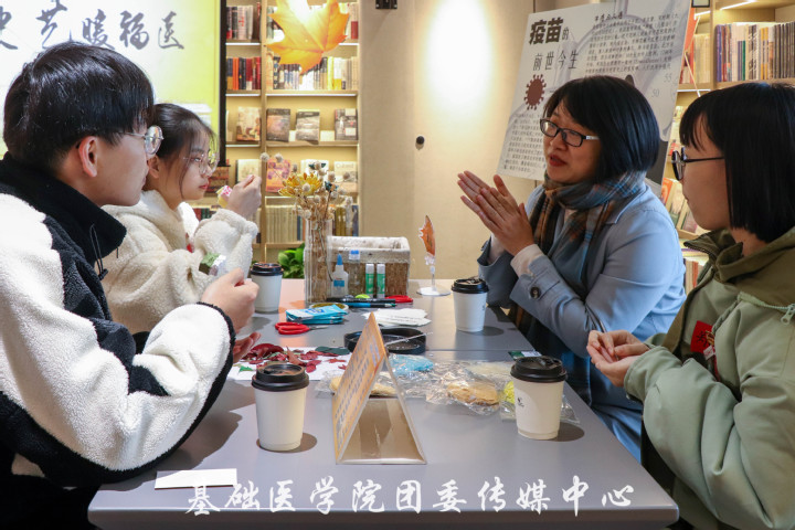 用树叶将平面的绘画带入立体的世界,用创作讨论将医识、医史和医德融入人心。各桌师生分别合作,利用提供的各色叶脉完成了“医以德先”、“基因治疗时代”、“疫苗的前世今生”、“病毒星球”、“外科风云”、“解剖的艺术”医学史主题海报的拼贴。同学们在讲解拼贴创作灵感的同时,也表达了这次活动交流的收获和感受,以及内心对未来医学的使命和展望。