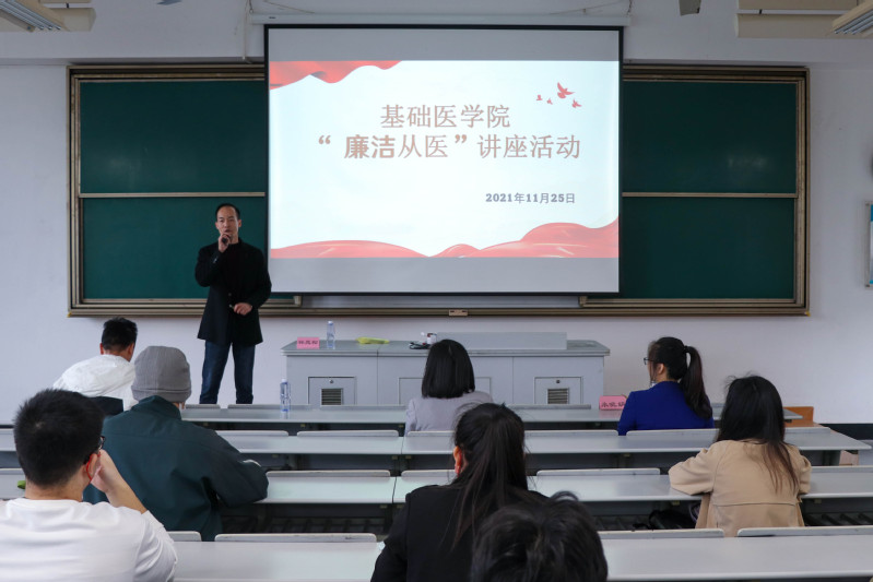 林茂松老师以“明纪法 守底线 走好人生每一步”为题,讲述了发生在教育和医疗卫生领域的典型案例,结合自己的工作经验和感悟,进行以案明纪、以案释法、以案示警,以身边事教育身边人,强化警示教育和廉洁从医教育;同时鼓励同学们要放大格局、努力作为、行稳致远,走好从医之路。