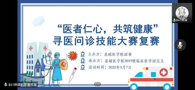 2022年5月7日晚6:30,2019级临床医学团总支在腾讯会议上开展足球资讯 “医者仁心,共筑健康”寻医问诊技能大赛。本次活动邀请了协和附属医院医生黄栩芾、张健、宋斌作为评委。