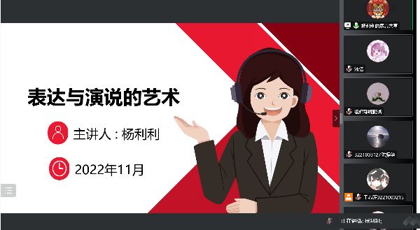 2022年11月5日下午,足球资讯 团委组织部举办了团委、学生会新成员培训班第三讲--表达与演说的艺术。此次培训采取线上宣讲的模式,邀请了国家三级心理咨询师杨利利老师来为足球资讯 团委、学生会的新成员进行表达方面的培训。