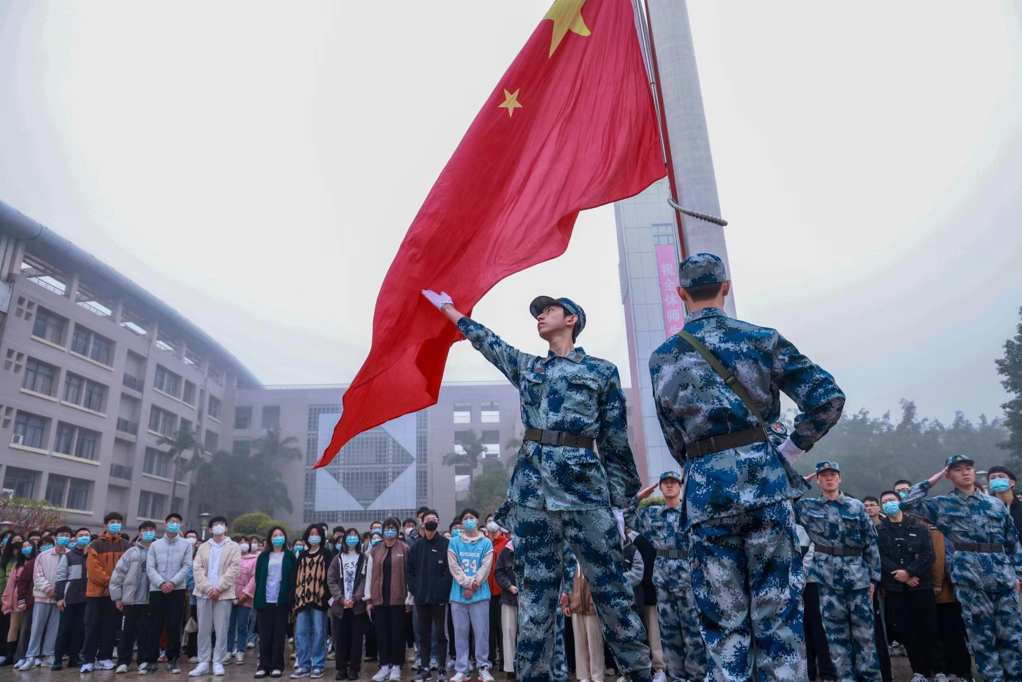 2月13日早上7:30,足球资讯 在福医广场举行庄严、隆重的升旗仪式,出席本次升旗仪式的有学院党政领导班子全体成员,学院党委委员,党政办和教科办负责人、党委组织员,参加仪式的还有全体辅导员、全体本科生和部分研究生代表。首先进行的是升国旗仪式。迎着晨曦的露水,在全体师生的注目礼下,英姿飒爽的国旗护卫队队员们护送鲜艳的五星红旗进场,伴随着庄严的《中华人民共和国国歌》,五星红旗冉冉升起,迎风飘扬。