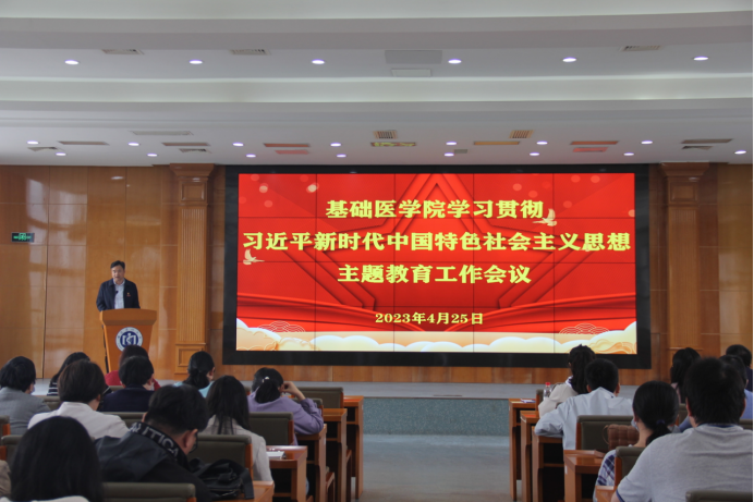 4月25日下午,足球资讯 党委在行政楼B座4楼学术报告厅召开学习贯彻习近平新时代中国特色社会主义思想主题教育工作会议,学院党委书记郭松斌主持。