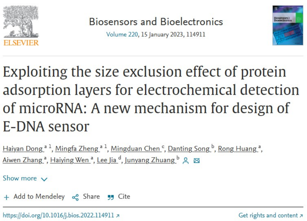 2023年1月15日,足球资讯-足球新闻最新 董海燕副研究员与药学院庄君阳副研究员合作,在Biosensors and Bioelectronics杂志(中科院JCR一区,IF=12.545)发表题为“Exploiting the size exclusion effect of protein adsorption layers for electrochemical detection of microRNA: A new mechanism for design of E-DNA sensor”的研究论文。该研究通过与双链特异性核酸酶(DSN)辅助靶循环策略偶联,开发了一种灵敏度高、特异性好、线性范围宽的新型电化学DNA(E-DNA)传感器,用于复杂生物样品中的微小RNA(miRNA)的检测,为构建E-DNA传感器提供了一种全新机制。