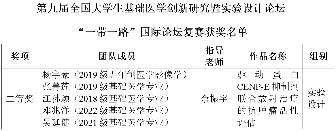 我校2020年起参加该项赛事,本届中南赛区基础临床赛道复赛一带一路国际论坛代表队由陈婉南院长亲自带队,8支队伍在线上、线下答辩和学习交流。经过紧张激烈的角逐,我校学子共计获一等奖1项、二等奖3项、三等奖1项,优秀奖2获奖名单如下),创下历年参赛以来赛绩又一新突破其中获复赛一、二等奖的4项作品将代表学校继续冲击在陆军军医大学举办的全国总决赛奖牌。