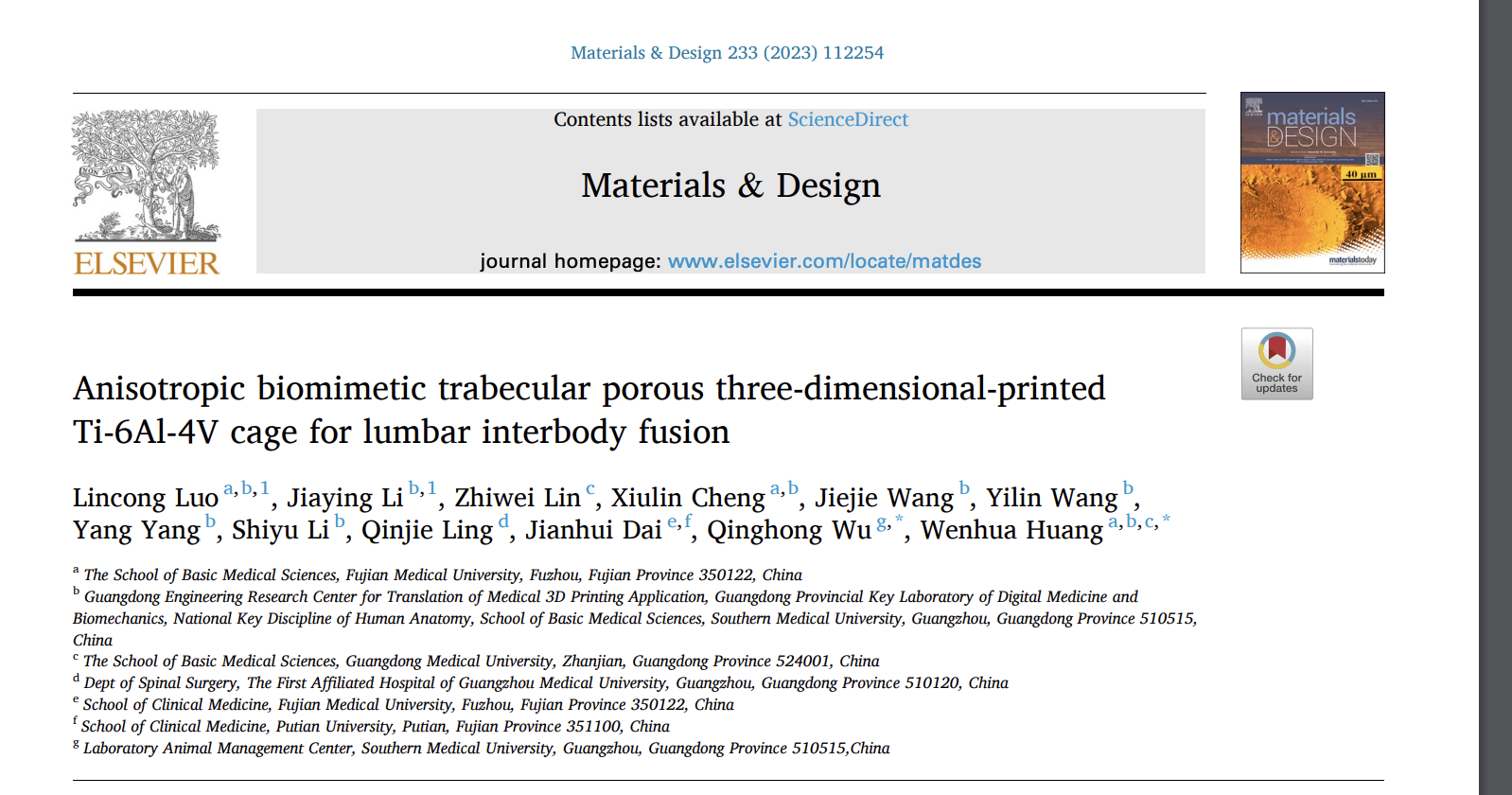 近日,足球资讯-足球新闻最新 客座教授黄文华团队在用于治疗退行性腰椎疾病3D打印椎间融合器方面取得进展,所撰写论文Anisotropic biomimetic trabecular porous three-dimensional-printed Ti-6Al-4V cage for lumbar interbody fusion(用于治疗退行性腰椎疾病的一种新型3D打印各向异性仿生骨小梁多孔Ti-6Al-4V椎间融合器)在Top期刊Materials & Design(《材料与设计》)以研究长文(Research Article)形式在线发表,该期刊2023年影响因子为8.4。