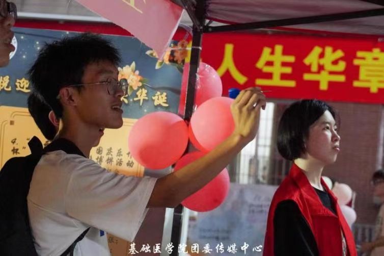 国庆趣味气球盲盒游戏在游园当天相当火爆。摊位后长长的队伍,空气中快速闪过的飞镖,kt板上不断传来的气球炸裂声,同学们意犹未尽的笑容,都在庆祝着双节的到来。
