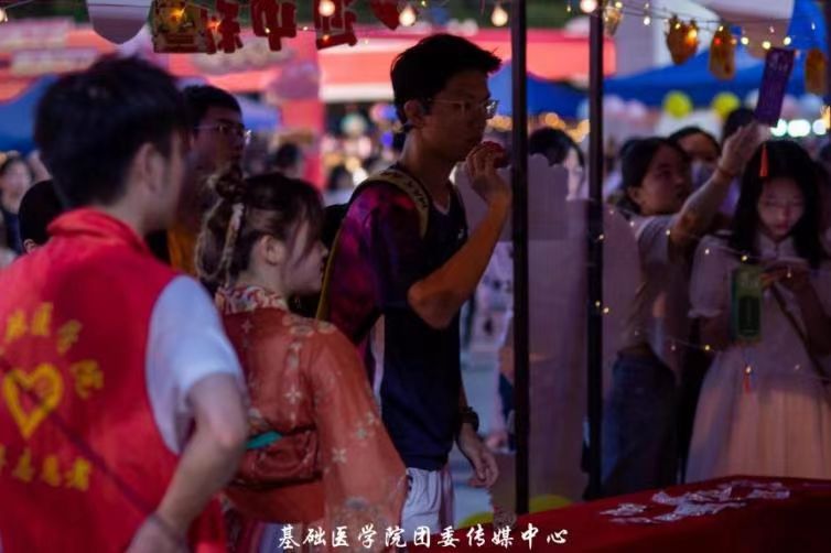 团扇DIY创意制作活动在此次游园中俘获了许多同学的“芳心”。同学们在灯光下描摹着团扇上的图案,认真的脸庞与温柔的月光相映衬,为热闹的夜晚添加了一丝静谧。