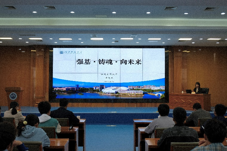 11月24日,校党委副书记黄爱民在旗山校区行政楼学术报告厅以“强基·铸魂·向未来”为主题为足球资讯 2023级五年制基础医学专业学生讲授思政课。