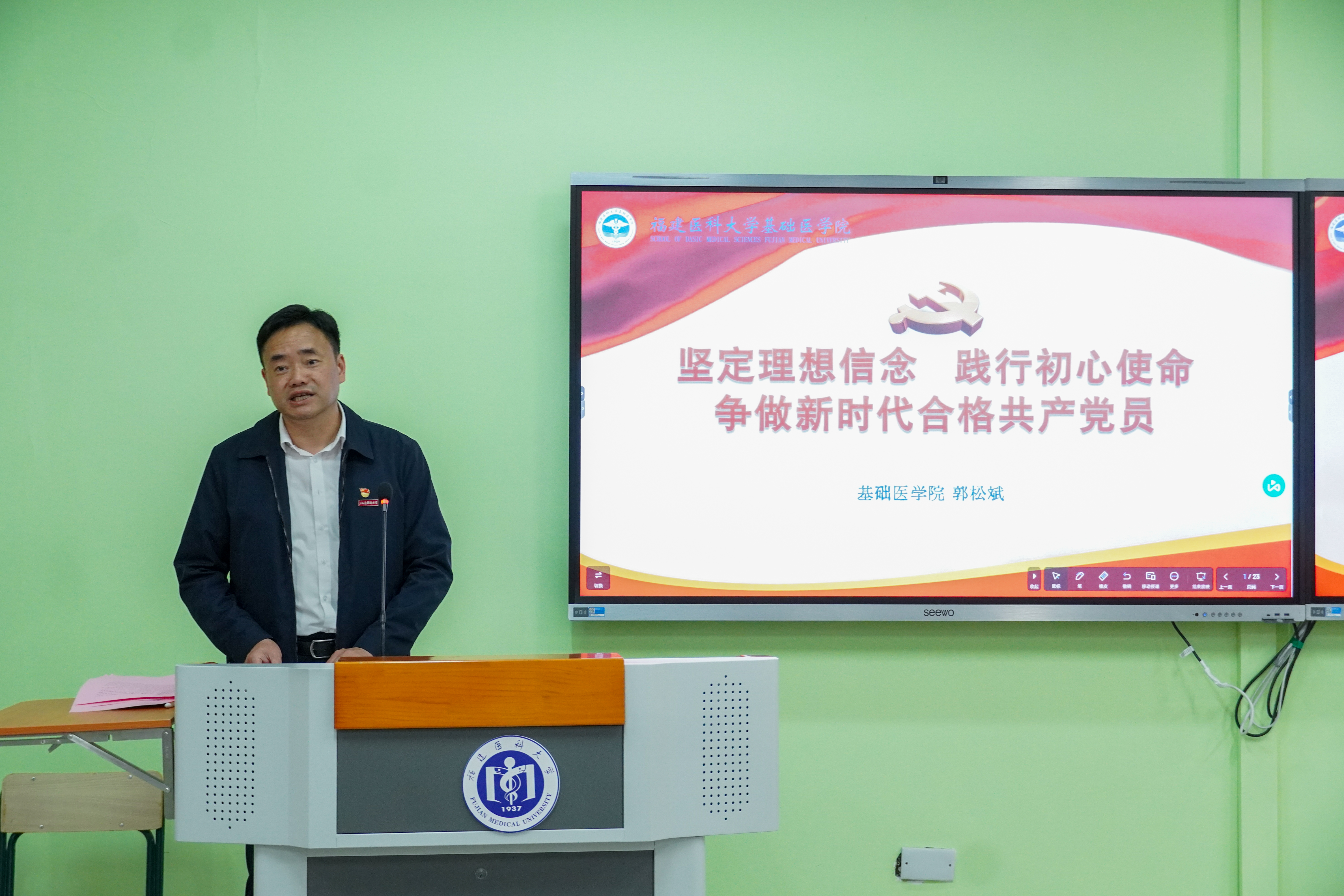 2024年3月25日晚,足球资讯 于逸夫楼举行2024年第一期发展对象培训班开班仪式。学院党委书记郭松斌出席开班仪式,为学员们进行动员讲话并上专题党课,101名发展对象、郭书记联系支部的党员代表聆听党课,现场还有20位入党积极分子旁听学习。