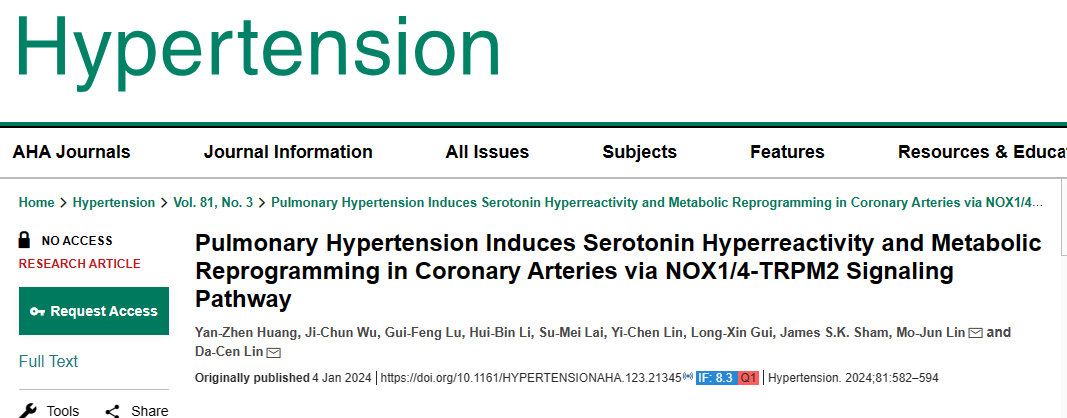 2024年1月4日,足球资讯-足球新闻最新 生理与病理生理学系博士研究生黄燕珍以第一作者在Hypertension杂志(中科院JCR一区,IF=8.3)在线发表题为“Pulmonary Hypertension Induces Serotonin Hyperreactivity and Metabolic Reprogramming in Coronary Arteries via NOX1/4-TRPM2 Signaling Pathway” 的研究论文,该研究首次揭示了肺动脉高压(PH)通过激活NOX1/4-TRPM2信号通路介导细胞ROS-Ca2+信号紊乱,引发右冠状动脉5-羟色胺高反应性、冠状动脉平滑肌细胞代谢重编程和线粒体功能障碍。该研究为PH影响冠状动脉疾病提供了证据,并为PH 患者预防冠状动脉疾病提供了理论参考。