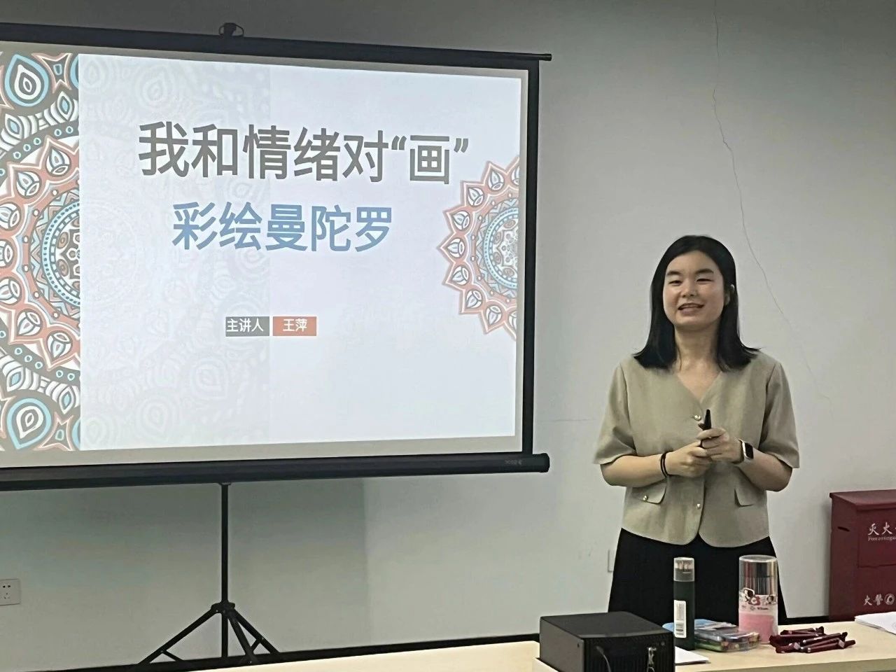 王萍老师通过一个小视频抛砖引玉,向同学们讲解情绪,进而引出本次活动的主题“曼陀罗绘画”。在轻松愉悦的背景音乐下,老师引导同学们找到舒适的状态,通过冥想回顾自己的生活;在王萍老师的引导下同学们画出自己心中曼陀罗花的模样。