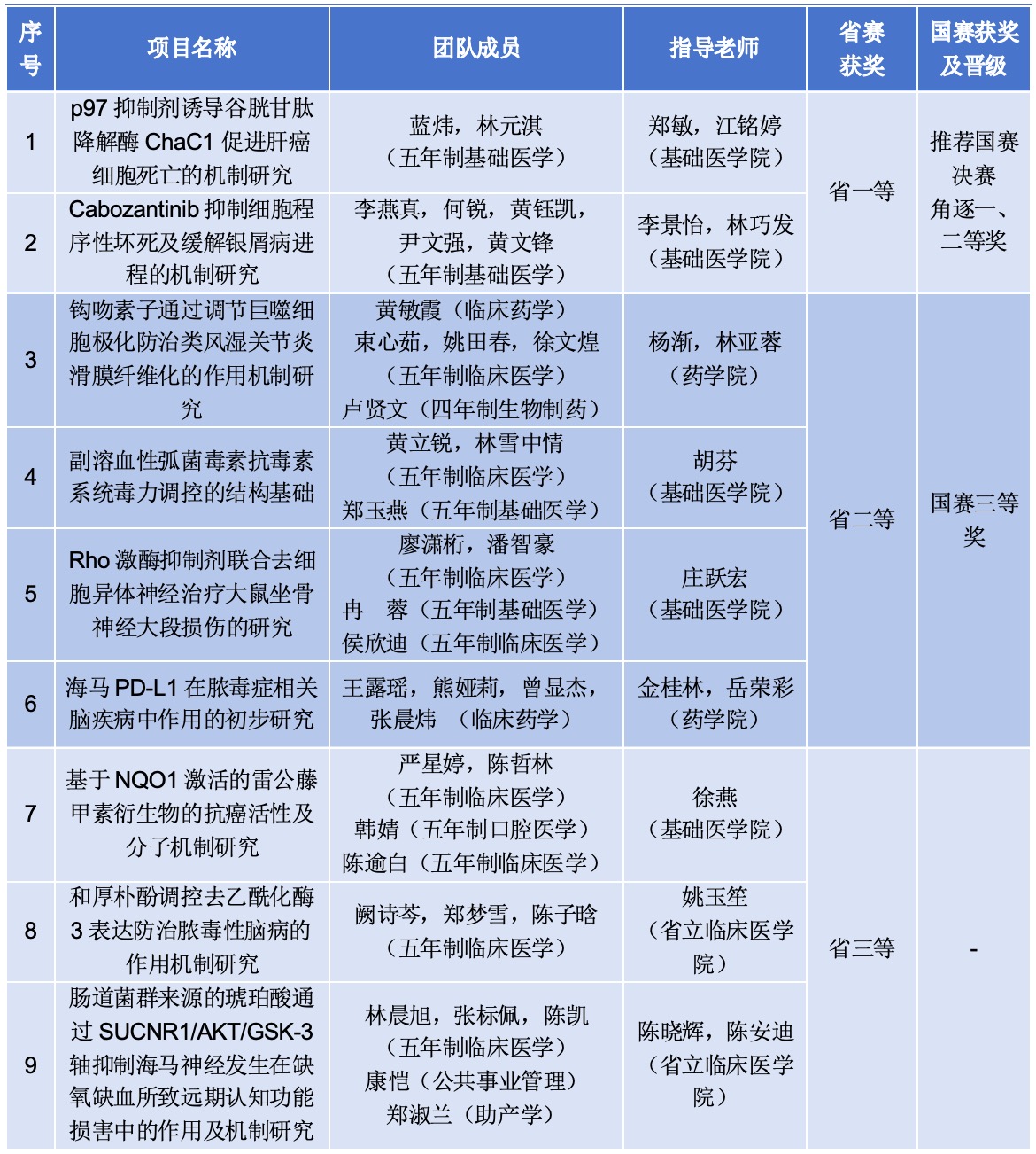 本届赛事由足球新闻最新 承担大赛本校管理员工作,经前期广泛宣传和组织,全校共有24支队伍报名参赛,19支队伍进入网络评审,9支代表队进入省赛。经过紧张激烈的线下答辩,共荣获省一等奖2项并推荐晋级国赛角逐全国一、二等奖,获省二等奖4项同时荣获国赛三等奖,获省二等奖3项(获奖名单见下)代表我校晋级国赛的两支代表队全部足球新闻最新 基础医学专业本科生组成