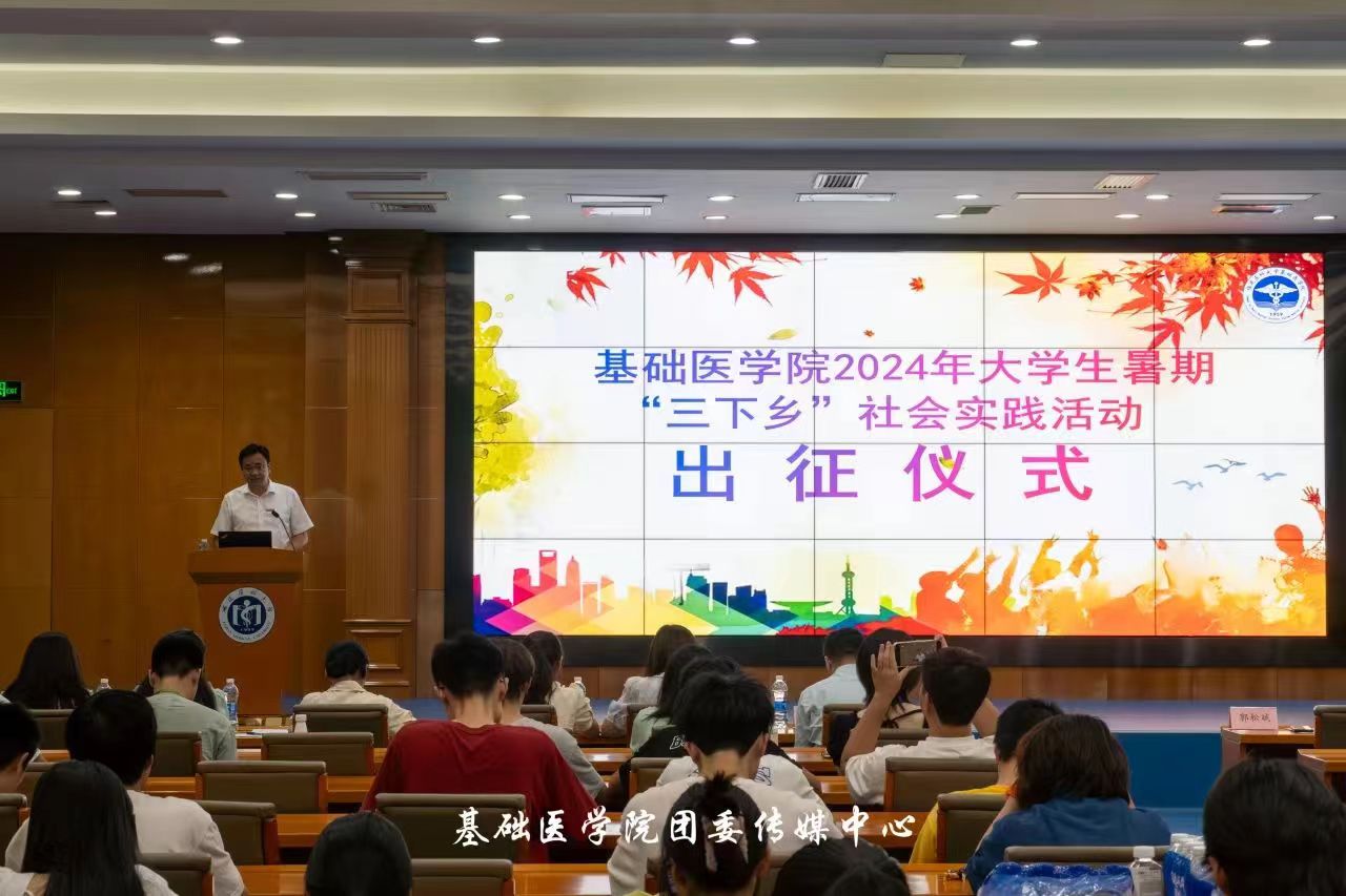 7月8日晚,足球资讯 在行政楼学术报告厅隆重举行2024年暑期“三下乡”社会实践出征仪式。学院党委书记郭松斌、党委副书记秦雷、团委书记杨翠玥,近100名实践队师生代表参加了本次出征仪式。