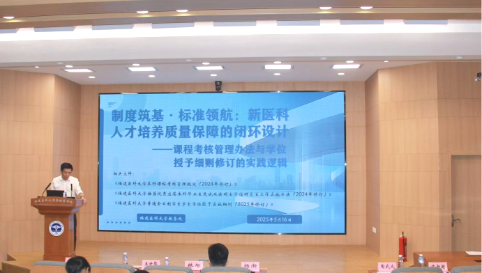 会上,教务处陈新超副处长做了题为《制度筑基·标准领航:新医科人才培养质量保障的闭环设计——课程考核管理办法与学位授予细则修订的实践逻辑》的报告,系统解读了课程考核、推免政策与学位授予制度的优化路径,通过考核评价牵引教学改革、学位授予倒逼培养质量,为构建“全过程、全链条、全闭环”的新医科人才培养体系提供实践方案。