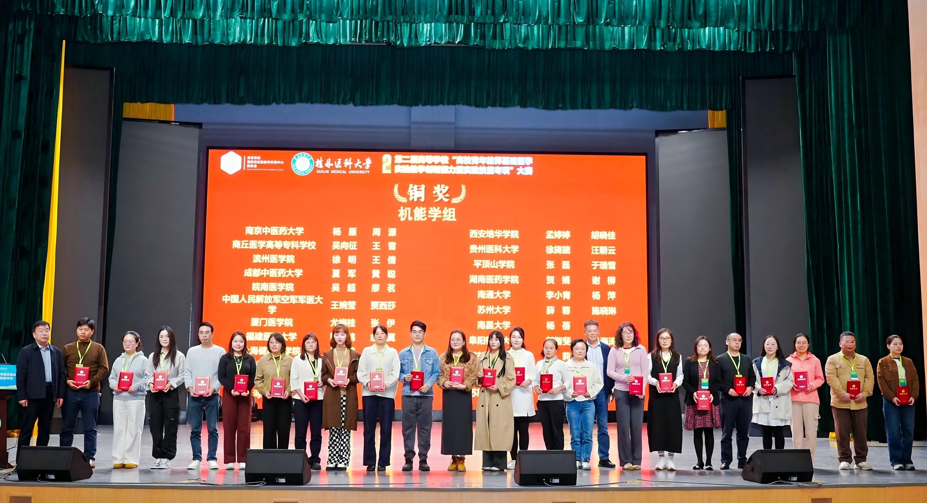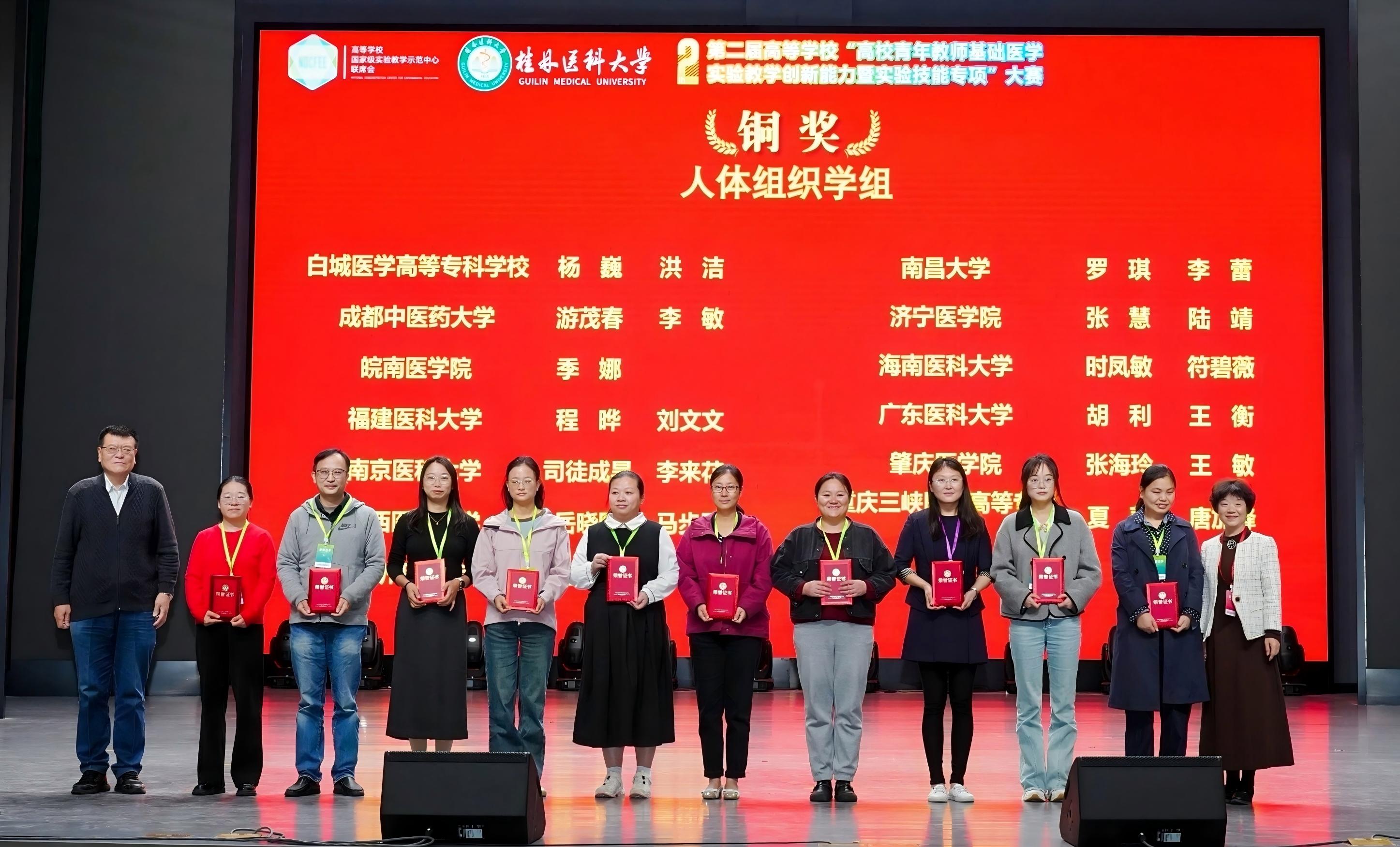 第二届高等学校“青年教师教学创新能力(基础医学实验技能专项)”总决赛10月25日在桂林医科大学举办,全国73所院校150支队伍参赛。足球新闻最新 病理学系程晔讲师、实验教学中心刘文文实验师、陈泽鸿实验师、余深翼助理实验师组成的两支代表队分别获“人体组织学组”、“机能学组”铜奖,展现了足球新闻最新 教师扎实的实验技能与创新的教学思路。学院将持续加强青年教师培养力度,推动教学质量进一步提升。