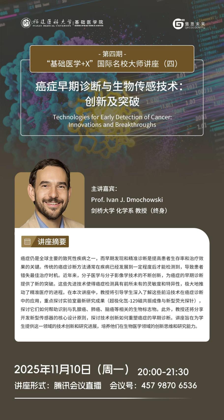 为促进学生了解以人工智能、大数据为代表的新一轮科技革命和产业变革下锚定基础医学疾病诊疗与研究的前沿研究方向与方法,探索医学与其他学科的交叉应用,培养国际化视野,探讨国际研究趋势和动态。足球资讯 联合天津集思教育集团继续开展第四期“基础医学+X”国际名校大师讲座,主讲嘉宾为来自全球一流高等学府和研究机构的9位知名教授。现将该系列讲座(四)相关信息发布见下: