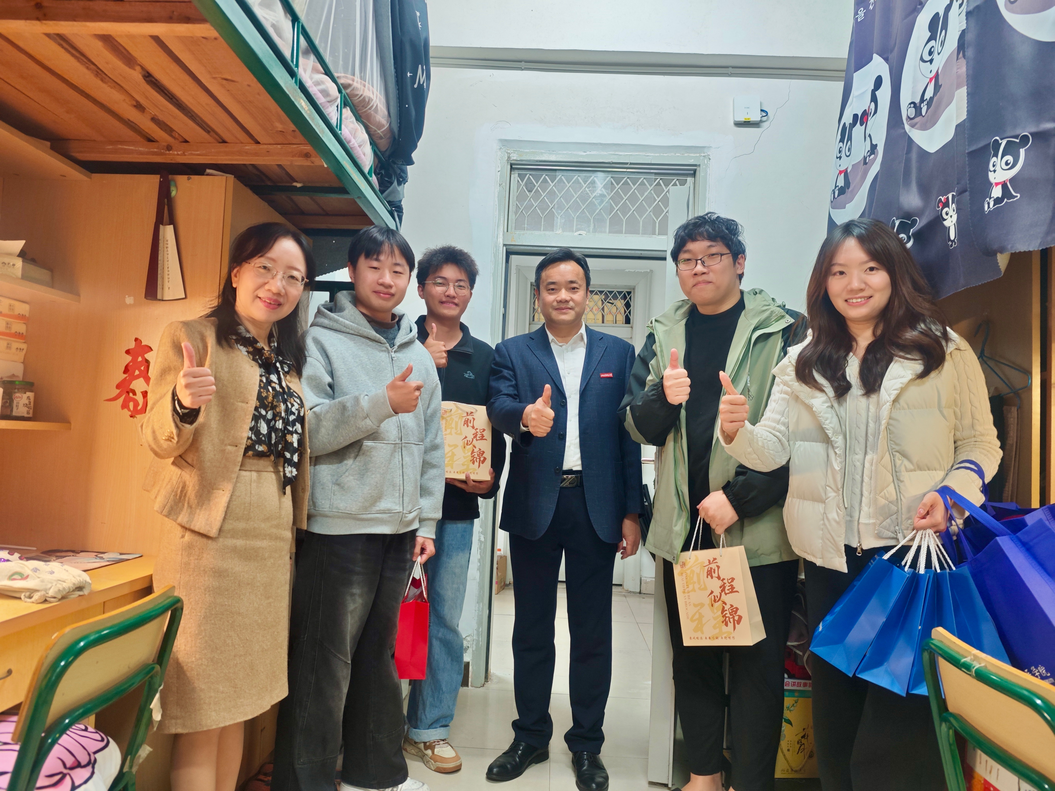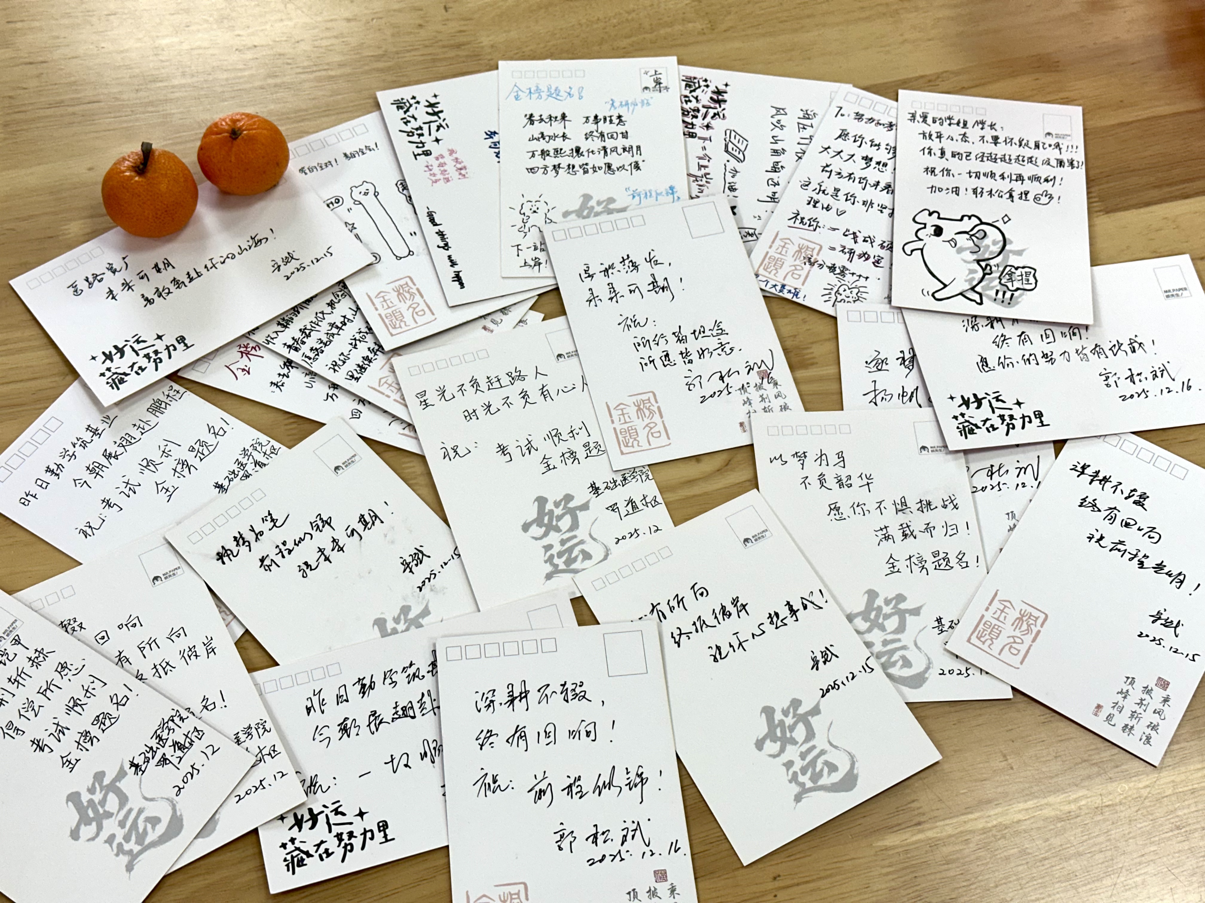 院领导、班主任、辅导员老师深入学生宿舍,把一份份温暖、一份份祝福逐一送至学子手中。这份近距离的走访与慰问,将学院的关怀化为亲切的交谈与叮咛,让温暖直接抵达学生心间。带班辅导员录制祝福视频,将殷殷叮嘱与美好祝愿,化作前行路上最亲切的陪伴;而学弟学妹们伏案书写的贺卡,则承载着后辈的敬意与支持,真挚的情谊构成了强大的情感支持。