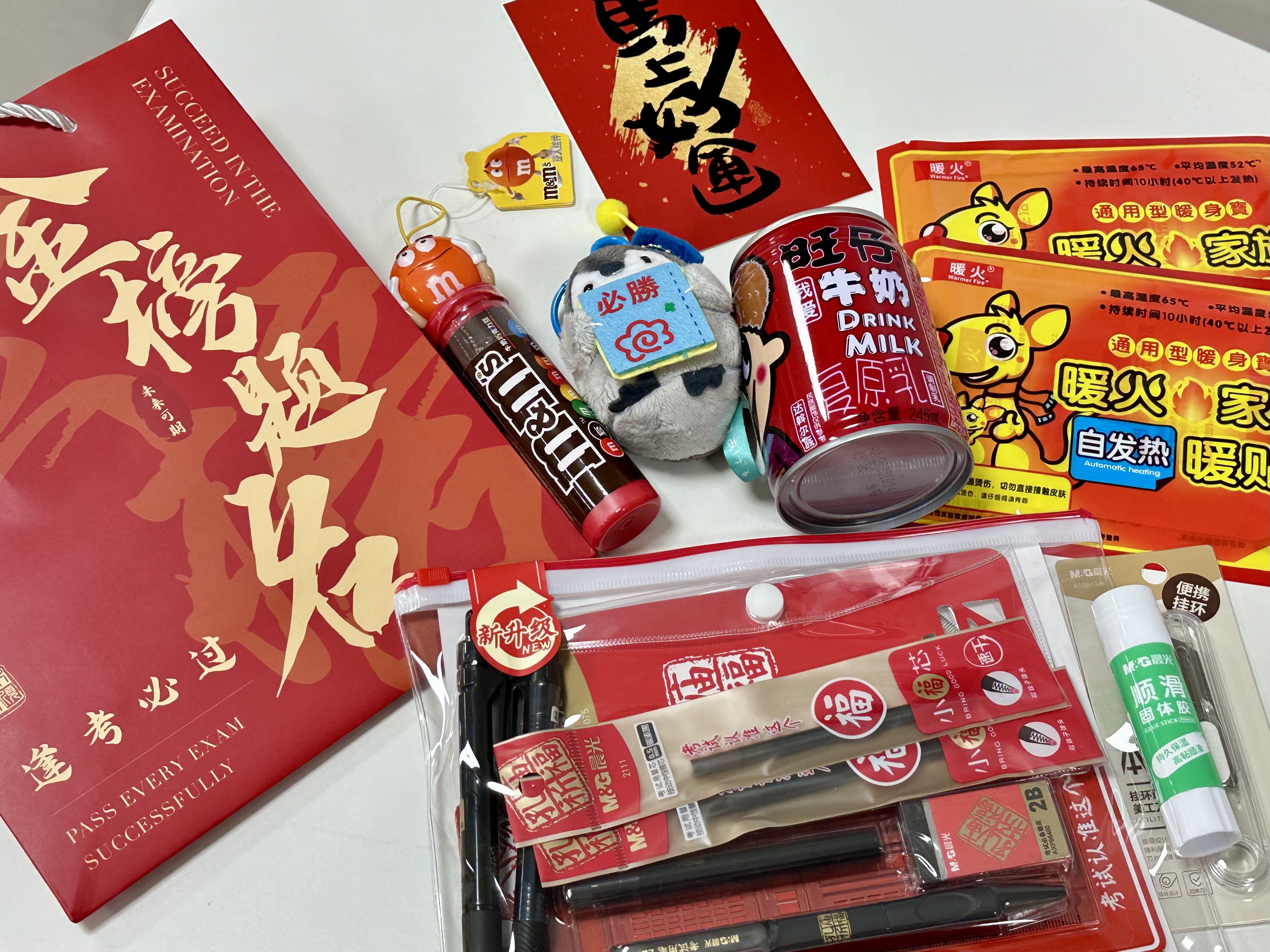 53份满载心意的“考研暖心礼包”,每一份都凝聚着学院深切的祝福与巧思:文具套装寓意“妙笔生花”,助力学子答卷如流;巧克力象征“巧克难题”,赋予同学们克服困难的甜蜜能量;可爱的好运企鹅玩偶寄托着“企”盼成功、“一路好运”的美好愿望;暖宝宝则在寒冬中送上物理与心灵的双重“温暖护航”;旺仔牛奶期盼同学们“运气旺旺,斗志昂扬”。此外,礼包内还有院领导、班主任、辅导员以及学弟学妹们亲手书写的祝福贺卡,字里行间流淌着真诚的鼓励与期盼。