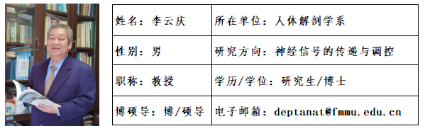 李云庆,男,1961年8月出生,河南新野人,博士研究生,空军军医大学教授/福建医科大学客座教授,博士生导师。现任中国解剖学会理事长、国际解剖学工作者协会联盟(IFAA)副主席、国际形态科学大会(ICSMS)和亚太地区解剖学会(APICA)执委、《神经解剖学杂志》主编、国际期刊《Frontiers in Neuroanatomy》副主编,国际期刊《Molecular Pain》、《Journal of Chemical Neuroanatomy》编委等职务。国务院学位委员会学科评议组第八届学科评议组成员。