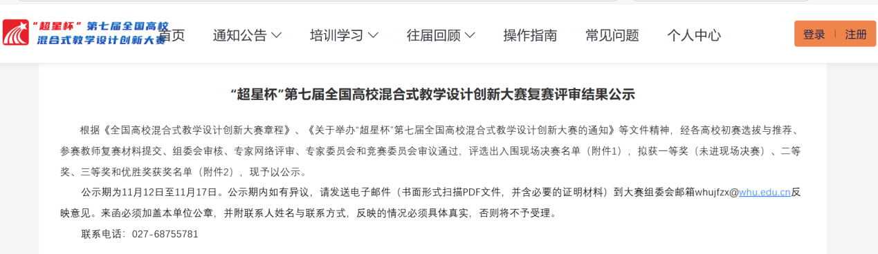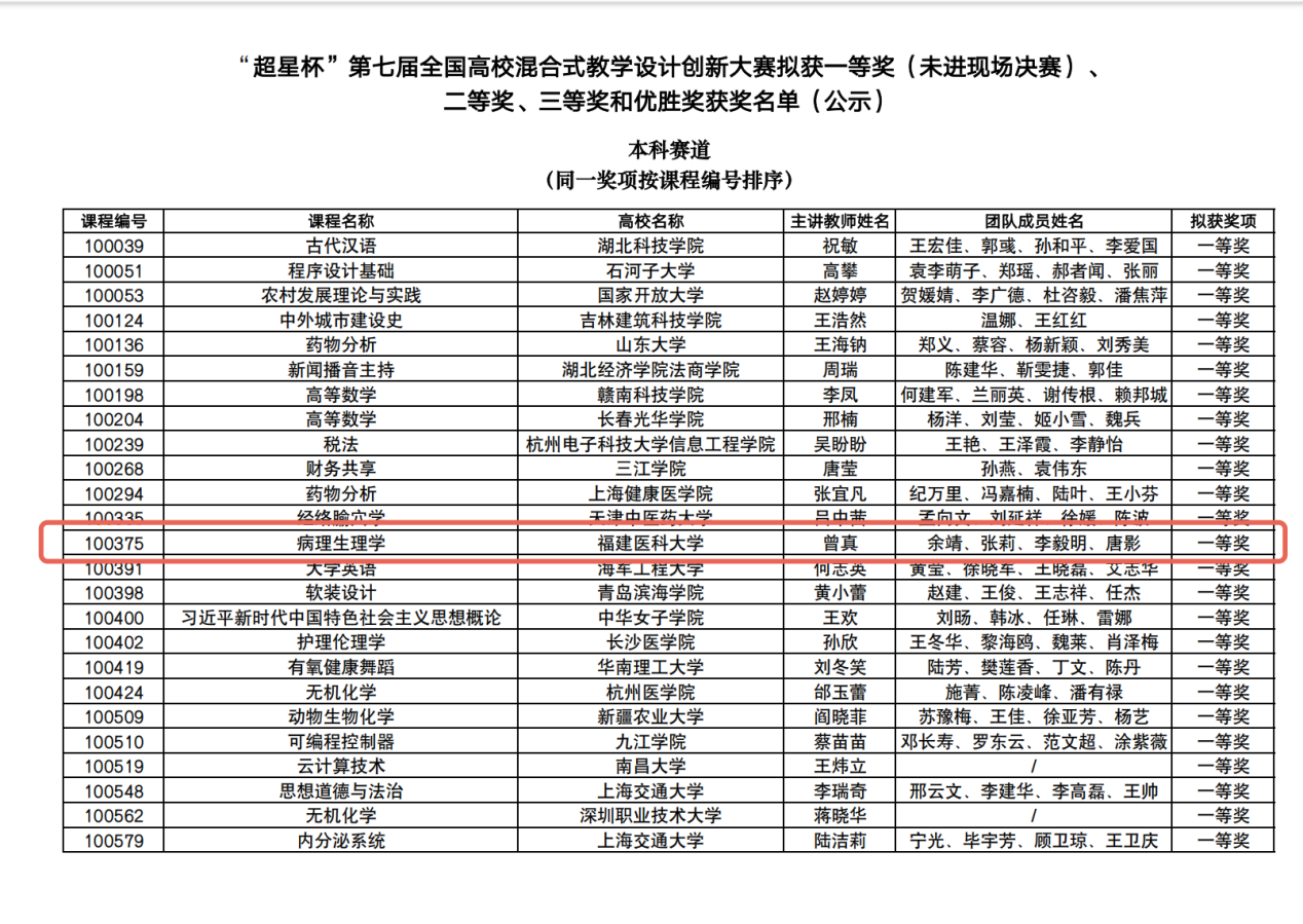 2025年11月12日,第七届全国高校混合式教学设计创新大赛复赛评审结果正式揭晓。本届大赛竞争激烈,共吸引全国本科高校上千支教师团队参赛。经严格评审,大赛共评出入围现场决赛的设计72项、一等奖60项、二等奖180项、三等奖219项,优秀奖444个。在此高水平竞争中,足球新闻最新 教师表现突出:生理学与病理生理学系曾真老师及其团队的《病理生理学》混合式教学设计荣获一等奖,病原生物学系李能老师及其团队的《病原生物学》混合式教学设计荣获三等奖。两项获奖作品充分展现了足球新闻最新 教师在混合式教学改革方面的创新设计与扎实功底。